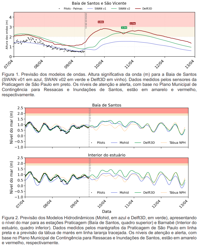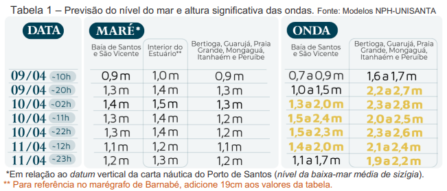 Com relação ao nível do mar a maré não estará elevada na região de orla e no interior do Estuário (Santos, São Vicente e Cubatão) entre quinta (09/04) e sábado (11/04). O nível máximo previsto é de 1,5m na madrugada de sexta-feira, por volta de 02h, representando um aumento de aproximadamente 40 cm de maré meteorológica em relação à tábua de marés (Tabela 1, Figura 2).