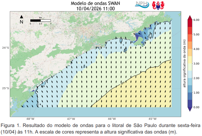 De acordo com as previsões dos modelos numéricos do Núcleo de Pesquisas Hidrodinâmicas da Unisanta (NPH-Unisanta), a Sala de Situação da Baixada Santista informa que devido ao avanço de uma frente fria, o mar ficará agitado na Baía de Santos e na orla das demais cidades da Baixada Santista a partir desta quinta-feira (09/04). A previsão indica ondas oriundas do quadrante sul que podem atingir 2,8m de altura significativa entre quinta e sábado (11/04) (Tabela 1, Figura 1).